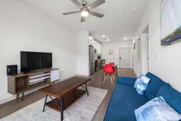 This apartment features soaring 9-foot ceilings, stainless appliances, custom cabinetry, elegant tiling, and modern decor. The fully equipped kitchen and smart TV with streaming apps provide all the amenities necessary to enjoy your stay. Complimentary coffee is provided.