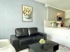 This apartment features a full kitchen with modern appliances and cooking essentials, including utensils, pots, pans, and a small assortment of spices. The living room includes a plush sofa and a large flat-screen smart TV for entertainment. The bathroom is stocked with a hairdryer and free toiletries. A coffee machine is provided with coffee, cream, and sugar. For your convenience, a washer and dryer are in unit.