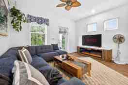 This "Life-Ready Basecamp" is designed for productivity and comfort across three vertical levels. It features two full kitchens and two separate living areas for ultimate privacy. The chef’s kitchen has stainless steel appliances, dark modern cabinetry, and ample counter space. The communal dining area features a solid wood table with high-capacity bench seating for meals. The living room has a deep, oversized sectional and electric fireplace console. There is a full-size washer and dryer for your convenience. Additional amenities include keyless entry and thermostat control, as well as high-speed Wi-Fi throughout.