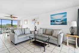 The condo features an open floor plan, charming minimalist decor, and beautiful tile floors throughout. Enjoy the at-home convenience of a fully equipped kitchen, stylish breakfast bar, and dining table. The large private balcony completes this space with a breathtaking view overlooking pristine beaches and emerald waves. The complex offers a swimming pool with lounge chairs throughout the deck, a charcoal grill area, shuffleboard, and a shared tennis and basketball court.