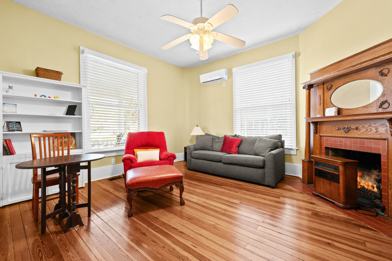 This cozy space features original heart-of-pine hardwood floors, a gas fireplace, and abundant natural light. Enjoy central AC and heating, fast Wi-Fi, and a smart TV with streaming capabilities. The full kitchen is equipped with full-size appliances, cookware, and dinnerware.