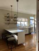Step into this beautifully renovated 2-bedroom home, where every detail blends modern luxury with coastal charm. The home features gleaming hardwood floors, a newly tiled bathroom, and an in-unit washer and dryer. The sleek all-white kitchen is equipped with quartz countertops, stainless steel appliances, a double-size dishwasher with disposal, and custom built-ins for ample storage. Enjoy unique touches throughout, including an all-marble shower, port holes in the guest bedroom and bathroom, exposed beams with built-in bookshelves, pocket doors, pendant lighting, and a heated lamp in the bathroom.