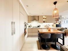 - Furniture and equipment: island with seating+storage, pendant light, blender, coffee-machine, toaster, kettle, panini press, dish rack, cutlery, crockery, tea-towels, etc.