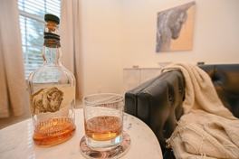 The primary bedroom is a beautiful room with a king-size bed, luxury mattress, linens, a large smart TV, a sitting chair, and a full-size mirror. The en-suite bathroom is newly renovated in 2023.