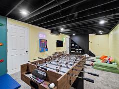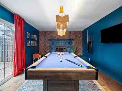 The first floor features a large living room with a comfy sectional, chairs, and a Smart TV. The recently remodeled kitchen includes an island with seating, modern appliances, and a fully stocked coffee bar with coffee, syrups, sugar, and creamer provided. The dining room seats 8, plus an additional bar-top for 2 that overlooks the game room. The game room offers a pool table, bar with barware, record player, Smart TV, and decorative fireplace. The basement is a kids’ paradise, featuring seating and a Smart TV, a Nintendo Wii with 3 games, a multi-game table (foosball, ping pong and air hockey), and a built-in climbing wall with cushioned mats below. Step outside to a private patio and fully fenced yard. Laundry room is available for guest use in a separate space in the basement.