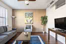 This apartment includes a fully equipped kitchen, a convenient island with barstools, and an in-unit washer and dryer. The open living area features a Roku TV and lightning-fast Wi-Fi. There are two master suites with smart TVs and a second full bath with a walk-in shower.