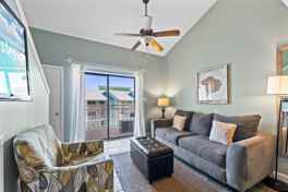 The condo features a comfortable living area with a flat-screen TV and a cozy sitting space. The equipped kitchen includes stainless steel appliances and granite countertops. A washer and dryer are included for your convenience. Step onto the private balcony to relax and take in side views of the beach and the Gulf. There are also two full bathrooms.
