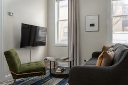 This apartment features in-unit laundry with a combination washer/dryer, a smart TV with Chromecast, and high-speed Wi-Fi. The sofa may serve as additional sleeping space, however please note it does not have a pull-out bed.