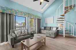 The primary bedroom features a queen bed and a remodeled private bath steps from the bedroom door. The second bedroom is a loft-style suite with en suite bath and up a spiral staircase. The loft bedroom contains an additional full-sized and twin bed. All bedrooms contain Roku-connected smart TVs for all your streaming favorites. The kitchen is fully stocked with everything needed to prepare a gourmet meal at home, and there is a dining table for 4 with additional bar stool seating. The comfy living room has 2 couches, a 65" smart TV with premium cable and streaming options, and there is great Wi-Fi at 100+ MBPS speeds. A private patio offers your own personal spot for enjoying the breeze in the evening.