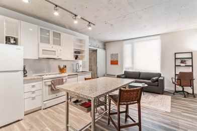 This modern apartment features a fully equipped kitchen, in-unit washer and dryer, central AC and heat, lightning-fast Wi-Fi, smart TVs, one queen-size bed, one private full bathroom, and a queen sleeper sofa in the living room. Community amenities include a 24/7 fitness center, theater, sauna, and rooftop club room and pool.