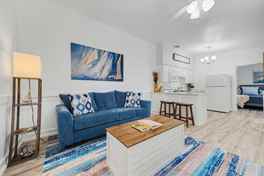 This apartment features a king-size bed, a full-size pullout sofa, vaulted ceilings, and a modern, fully equipped kitchen with an oven, stovetop, microwave, and fridge. The warm coastal wood cabinetry complements the dining table and coffee maker. Enjoy the convenience of detached on-site laundry shared with other units, and relax in the living area with a comfy pullout sofa, smart TV, and ceiling fan. The bedroom also includes a smart TV and closet storage. Fresh linens, bath and beach towels, coffee, and starter toiletries are provided.