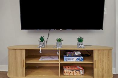 Designed to serve a short getaway or a longer business trip, the apartment is fully stocked with items and amenities to cater to business travelers, couples, and small families with children. The spacious bedroom features a memory-foam king-size bed, a fully stocked bathroom, and a walk-in closet. The stylish living room includes a smart TV, comfortable seating, board games, and a dedicated dining area. The fully stocked kitchen features a coffee station, stainless steel appliances, and cooking supplies. There is also in-unit laundry, outdoor BBQ grills, and a community lounge.