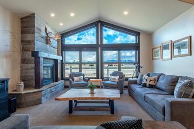 This home offers two full living spaces, including a bright upstairs great room with floor-to-ceiling windows and a cozy downstairs lounge with TVs, a huge sectional, and a game table. The gourmet chef’s kitchen features granite counters, a 10-ft island, double ovens, a gas cooktop, and multiple coffee options. Enjoy indoor-outdoor mountain living with a sunrise deck, a sunset porch, and a private fire-pit under the stars. The main level includes a large open great room, a master suite, two additional bedrooms, a full laundry room, and a dining area overlooking the Tetons. The lower level features a second living room, three more bedrooms, and an additional bathroom.