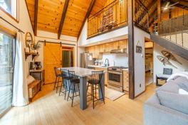 The fully remodeled interior combines cozy cabin charm with modern finishes. Sleeping up to 6 guests with multiple comfortable sleeping areas, this cabin offers a relaxed living space ideal for movie nights, board games, and hanging out. The fully equipped kitchen includes modern appliances, cookware, dishware, and essentials. Enjoy the large front deck with seating for 8–10 and a BBQ area with grill for easy outdoor cooking and summer gatherings. A fully fenced patio is also available.
