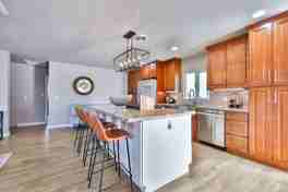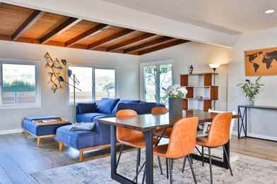 The modern kitchen boasts stone counters, stainless appliances, and a Keurig machine, all fully stocked with essentials for cooking. Relax in the family room with a big sofa and an 85-inch 4K TV and enjoy meals at the cozy dining table. Each of the 3 comfortable bedrooms is designed for comfort and functionality. Outside, soak in canyon views from the spacious deck, complete with a spa tub, gourmet BBQ, and real grass backyard.
