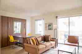 You’ll enjoy a fully equipped kitchen and a comfortable sleeping set-up that adapts to your needs. Amenities include self check-in, high-speed Wi-Fi, a smart TV, a private balcony, in-unit laundry, a dining table, an additional workspace/dining table via a Murphy bed, and a 24-hour fitness center.