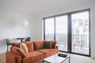 The apartment comfortably sleeps two with a queen bed and has flexible seating areas so you can work or relax at your convenience. The living room sofa may serve as an additional sleeping area, however please note it does not have a pull-out bed. Amenities include a 24-hour fitness center, yoga studio, work stations, conference room, game room and lounge, shared outdoor pool, smart TV, self check-in, high-speed Wi-Fi, dedicated workspace, laptop-friendly workspace/dining table, private balcony, and in-unit laundry.