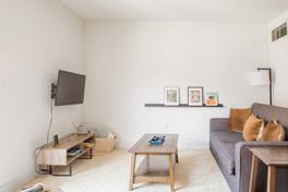 This apartment sleeps two with a comfy queen bed. The living room sofa may serve as additional sleeping space but please note it does not have a pullout bed. Amenities include a private balcony, smart TV, in-unit laundry, self check-in, high-speed Wi-Fi, dining table/workspace, fitness center, and community room with a kitchen, lounge areas, shuffleboard, pool table, and bags (otherwise known as cornhole).