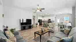 This single-story home features an open layout and is designed with real-life comfort in mind. The kitchen is fully equipped for everyday cooking and features a large island with bar seating. The living and dining areas flow seamlessly together, creating a relaxed space. The primary suite offers a king-size bed, private bathroom, walk-in closet, and a cozy seating area. Two additional bedrooms provide flexible sleeping arrangements. Outside, enjoy a fenced backyard, covered patio, and grill. A washer and dryer and a two-car garage provide convenience for extended stays.