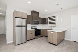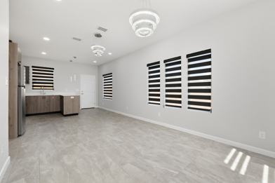 The kitchen includes contemporary cabinetry, stainless steel appliances, and a large island perfect for everyday meals or entertaining. Both bathrooms have modern finishes, including updated vanities and stylish fixtures, with a walk-in shower in the primary suite.