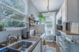 The apartment's design choices are light and airy, giving the space a relaxing and clean appeal. The bright kitchen is well stocked. The cozy bedroom features a high quality queen mattress and black out curtains to ensure good rest.