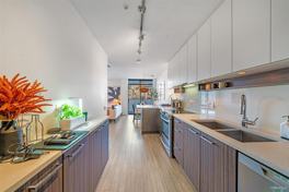 CONCRETE low rise building in prime Burnaby Heights. This 620sf one bed has a spacious living/dining area. Plenty of storage in kitchen w/ wraparound island for extra counter space or seating. Nook by front entry can easily fit a desk if required. Radiant in-floor gas heating (included in strata fee). Amazing location with everything at your doorstep including shops, restaurants, cafes, grocery and more. Parking and LARGE storage locker included. Large "Common Living space" and Roof Garden on top floor with Fire place, and a beautiful view of the mountains.
