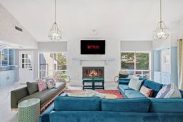 This beautifully designed property features a fully equipped chef’s kitchen with high-end appliances, ample cabinetry, and a large island with high seating, as well as a drip coffee maker. The expansive living area includes a smart TV, a large plush L-shaped sofa, reading chairs, and an open floor concept leading to the kitchen and dining area. Enjoy amenities such as a heated outdoor pool, hot tub, fire pit, grill, tanning beds/loungers with beach umbrellas, a basketball court, patio/outdoor seating, al fresco dining, a hammock, and backyard games like cornhole, giant connect 4, giant Jenga, and putt putt. There is also a game room with a smart TV, arcade games, pool table, ping pong, and a plush sofa, plus a kids corner with a tepee hut, rodeo round up jungle gym, kitchen playset, minimart playset, kids table and chairs, books, and kids toys.