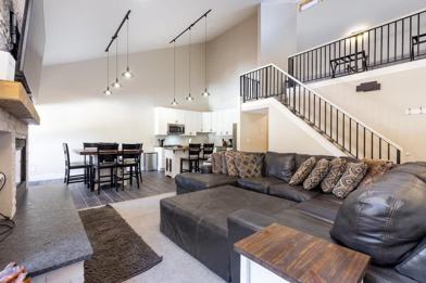 This beautifully appointed condo features two primary bedrooms, both with an en-suite bathroom. The loft area, overlooking the living room, includes additional sleeping arrangements. Relax in the spacious living room, where a stone fireplace creates a cozy ambiance. The living area opens up to a dining space that comfortably seats eight, with additional bar seating available at the kitchen counter. The newly remodeled kitchen is ready for your culinary adventures, featuring modern appliances, solid-surface countertops, and all the necessary cookware and gadgets. Amenities include smart TVs in the living area and bedrooms, and an in-unit washer and dryer.