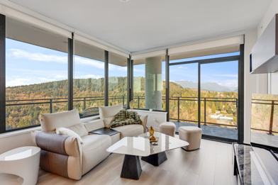 This high-floor unit features 887 sq ft of interior space, 9’ ceilings, an open-concept layout, and a large 220 sq ft covered balcony. The den is perfect for a home office or guest space. Primary bedroom includes an ensuite.