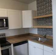 Open custom shelves in kitchen in a secure historic apartment building downtown, walkable to all the downtown shops and restaurants.