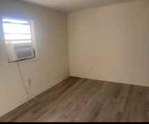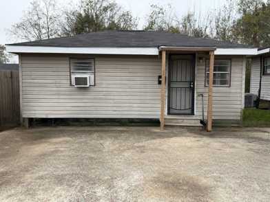 1 bedroom, 1 bathroom house available. The home has window AC units and a concrete driveway for parking.