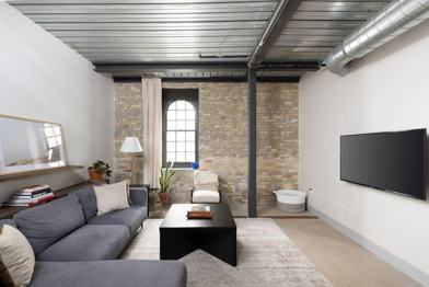 Feel at home in this apartment situated in one of Milwaukee's most historic buildings, showcasing architectural features such as original Cream City brick, exposed beams, arched windows, and city skyline views. The space comfortably sleeps four.