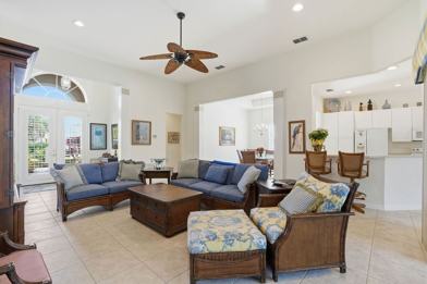 This home features a split floor plan, with bedrooms located on one side and generous living spaces on the other. Inside, the home showcases classic Florida décor with a warm, welcoming feel. Living spaces include a formal dining room, a large family room, and an open breakfast nook adjacent to the entry foyer. The laundry room is conveniently located near the dining area and garage. The screened lanai features a large heated pool and spa, surrounded by privacy hedging for a peaceful, secluded experience. Guests can relax on chaise loungers, enjoy meals at the covered outdoor dining area, or grill with the propane gas grill. A wall-mounted smart TV and ceiling fan make the lanai comfortable year-round.