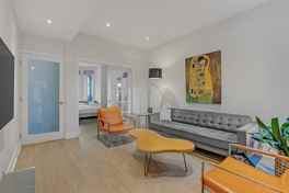 LIVING ROOM: 55' 4K TV, Apple TV, Sofa, 2 Lounge Chairs, 3 Sonos.