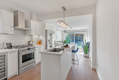 Modern kitchen design with high end appliances, quartz counter top and island, fully equipped with cooking utensils and dining set. Nespresso machine.