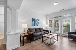 Feel at home in this meticulously curated, furnished 2-bedroom executive apartment in The Arboretum in Cary, North Carolina. This end unit offers stunning courtyard views and direct access to the attached parking garage.
