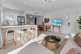 This apartment features fully furnished interiors, a modern kitchen, and high-speed Wi-Fi. The open living area includes a plush sofa, accent chair, and Smart TV. The kitchen features stainless steel appliances and a breakfast bar. A shared ground-floor laundry room and central air conditioning are also available.