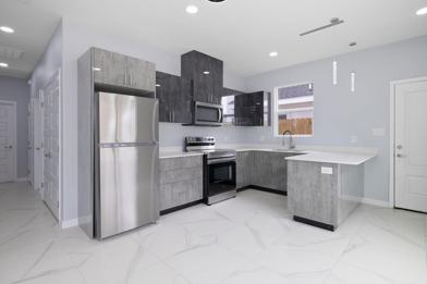 The kitchen includes contemporary cabinetry, stainless steel appliances, and a large island perfect for everyday meals or entertaining. Both bathrooms have modern finishes, including updated vanities and stylish fixtures, with a walk-in shower in the primary suite.
