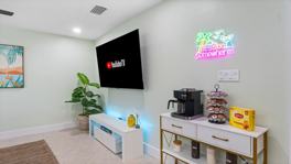 This 'Margaritaville' unit features high-end finishes and a fully equipped kitchen. Entertainment is provided on the 75" smart TV with YouTubeTV, NFL Sunday Ticket, and NBA GamePass via gigabit Wi-Fi. Beach essentials like 2 beach chairs, towels, and an umbrella are provided. Enjoy the coffee bar, hammock, outdoor surfboard shower, outdoor patio seating, turf backyard, cornhole, and giant Connect 4.