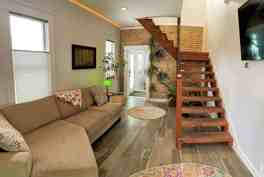 Recently renovated and modernized, this unique residence stands out. The living space is above ground, with two bright bedrooms on the main floor and one huge bedroom with 7 windows on the second floor. Each floor has its own full bathroom, and there is a modern kitchen that's fully stocked with everything you'll need to cook full meals. The backyard is fully fenced and has plenty of shade trees and outdoor furniture. The master bedroom has high ceilings and a bonus dormer room attached to it, featuring a low ceiling, lounge pillows, and a thick rug for lounging and movie watching. Free ultra high-speed Wi-Fi is provided.