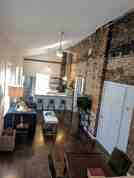 The kitchen serves as a perfect launching point for your evenings, equipped for making coffee and breakfast at the breakfast bar. The expansive private balcony is beautifully furnished with plants and ample seating, creating an inviting outdoor space. Inside, you'll find a harmonious blend of original character and modern comforts, including exposed brick walls, hardwood floors, granite and marble countertops, a gaming table, a small desk, high vaulted ceilings, a nicely equipped kitchen, a two-basin bathroom vanity, and full-length mirrors.