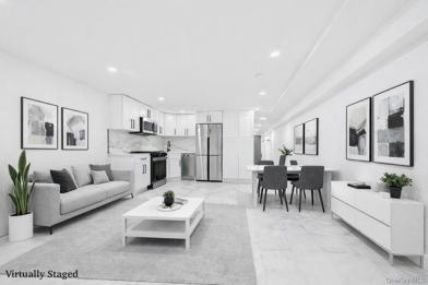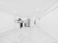 This renovated 2-bedroom, 1-bath garden-level residence offers modern finishes, generous natural light, and a thoughtfully designed layout. The open kitchen and living area features full-size stainless steel appliances, a double-door refrigerator, sleek white cabinetry, quartz-style countertops, and contemporary recessed lighting. Both bedrooms are well proportioned, with the front bedroom comfortably accommodating a queen-size bed and the rear bedroom fitting a king-size bed. Each bedroom features built-in wardrobes and windows, providing excellent natural light throughout the unit. The full bathroom is finished with striking tilework, matte black fixtures, and a rainfall showerhead. Marble-style flooring runs throughout, and ductless split-system heating and cooling provides efficient year-round comfort. The unit is full height from floor to ceiling, with storm-rated, weather-tight entry doors. A spacious entry foyer provides flexibility for storage or a mudroom setup. Additional features include a private entrance, private outdoor space, and in-unit washer and dryer. Carport parking may be available, subject to vehicle size and arrangement. The property is located approximately three blocks from the Utica Avenue subway station, offering access to express service, and is conveniently positioned near local cafes, restaurants, grocery options, retail corridors, parks, and multiple public transportation options serving surrounding Brooklyn neighborhoods. Garden unit. Renovated. Available for immediate occupancy.