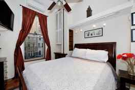 This spacious, sun-flooded apartment features high ceilings, hardwood floors, large windows, and a balcony facing a private garden. The living area comes complete with a queen-size sofa bed and a state-of-the-art media center with a 54” HDTV and a Wi-Fi router. The bedroom includes a queen-size bed, a dresser, and two large closets. The kitchen features granite countertops and brand new stainless steel appliances, including a microwave and dishwasher. It is also fully stocked with a toaster, coffee maker, and a water kettle. The European-tiled bathroom has a bathtub and shower, extensive storage below and above the sink, and a toilet. The living room and bedroom have their own separate remote-controlled, quiet AC/heating units. A coin-operated laundry room is located in the basement. Wired and Wi-Fi dedicated high-speed internet connection is available.