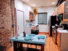This home blends vintage charm with modern convenience, featuring exposed brick walls, hardwood floors, and a beautifully updated kitchen with stainless steel appliances, dishwasher, over-the-range microwave, and a comfortable dining area.