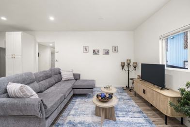 This single-level home features a modern kitchen, updated bathrooms, and stylish furnishings throughout. The bright, open-concept living and dining area features modern furnishings and a smart TV in the living room. The newly renovated kitchen features stainless steel appliances and cooking essentials. There is also an in-unit washer and dryer for added convenience.