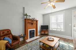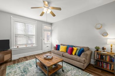 Enjoy a spacious living room with a historic fireplace and large window providing great natural light. The fully stocked kitchen offers updated appliances and cabinetry, a dining space and all the furnishings to make you feel right at home. The in-unit laundry right outside the bathroom and bedroom makes it convenient and easy. The oversized bedroom located in the rear of the unit offers a queen bed, large closet with organization cubes, hanging space and drawers as well as a ceiling fan and full length standing mirror to make sure you look your best before facing the world. Central AC, forced air heating, complimentary WiFi, smart TV and fully stocked with linens and starter soaps/shampoo/lotion make settling in a breeze!