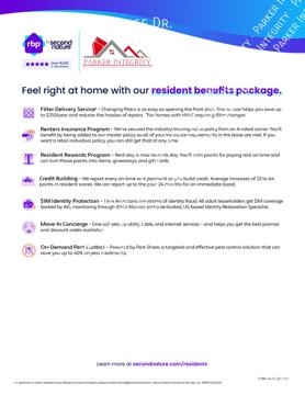 At Parker Integrity, we strive to provide an experience that is cost-effective and convenient. That’s why we provide a Resident Benefits Package (RBP) to address common headaches for our residents. Our program handles insurance, pest control, air filter changes, utility set up, and credit building (optional) at a rate of $60.00/month, added to every property as a required program. More details upon application.