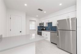 The kitchen features quartz countertops, an eat-in layout, and all-new stainless steel appliances, including a range, dishwasher, microwave, and refrigerator. A dedicated laundry/utility room features a new washer and dryer. Polished terrazzo floors and LED lighting create a bright, contemporary feel, while impact windows provide added comfort and efficiency.