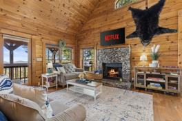The cabin features warm wood interiors and open living spaces. The fully stocked chef’s kitchen has high-end stainless appliances, a large refrigerator, ample cabinetry and cooking space, and a coffee maker (Keurig and drip). The living room has a 60” Smart TV, a large plush sofa, an indoor fireplace, and a high vaulted ceiling. The game room is complete with a wet bar, a pool table, and a private sauna. Outdoor amenities include an expansive deck with stunning mountain views, a hot tub, a fire pit, an outdoor patio/dining area, a BBQ grill, and ample outdoor seating. There are TVs in each bedroom, a washer and dryer, and board games.