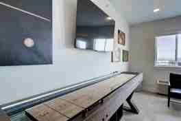 The open floor plan is designed to provide a seamless flow of space, allowing you to make the most of its generous layout. The fully stocked kitchen makes mealtime a breeze with a top-notch set of non-stick pots and pans, along with complementary cooking essentials. The light-filled dining room is open to the kitchen and features a table that can seat four. The living room is adjacent to the dining area and kitchen, featuring a 55” TV, a 9-foot shuffleboard, and cozy seating options. The back deck, located off the living room, has outdoor seating.